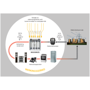 The MAXiiMUS derives its energy from the permanent flow of electrons from nature. This flow of electrons is caused by the difference in potential between the ionosphere and the earth. The strong Tachyon field in the accumulators inside the MAXiiMUS acts as an antenna which derives electrons from this potential difference and injects them directly into the circuit. This process enhances the efficiency of the electricity, which in turn leads to less power consumption.