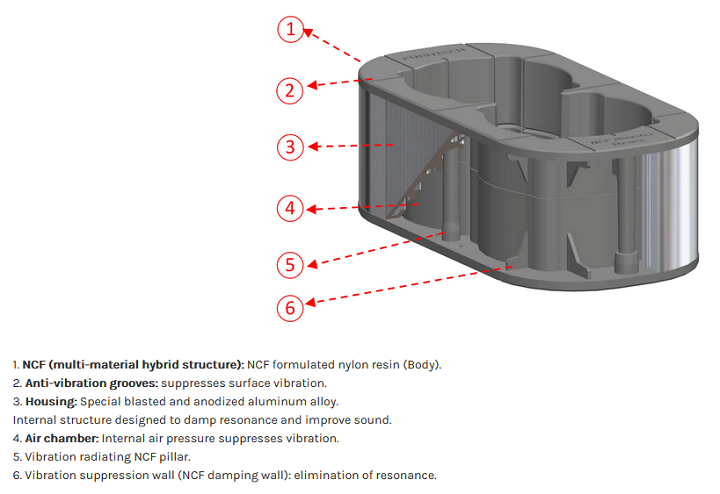 The NCF material is the same noise and vibration reducing material Furutech uses in their FI-50 NCF plugs. NCF features a special crystalline material that has two ‘active’ properties. First, it generates negative ions that eliminate static charge. Second, it converts thermal energy into far infrared. Furutech combines this remarkable material with nano-sized ceramic particles and carbon powder for their additional ‘piezoelectric effect’ damping properties. The resulting Nano Crystal Formula is the ultimate electrical and mechanical damping material.