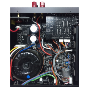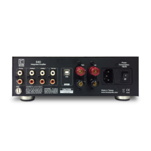 Despite the powerful discrete output stages and high quality linear power supply, this small powerhouse doesn’t even occupy the space of an A4 paper sheet. It has 40 Watts per channel into an 8 Ohms loudspeaker, which can be tapped from the massive loudspeaker connectors, that will accept either banana plugs or bare wires. Four inputs are available, two line level analog ones, one MM input for your turntable and one USB input for digital computer-, tablet- or smartphone audio. Under most circumstances the internal power stages will completely satisfy, but in case more power or bass is needed, you can connect an external power stage or subwoofer to the stereo line level preamp outputs. As an added bonus, the E40 has an outstanding headphones output.