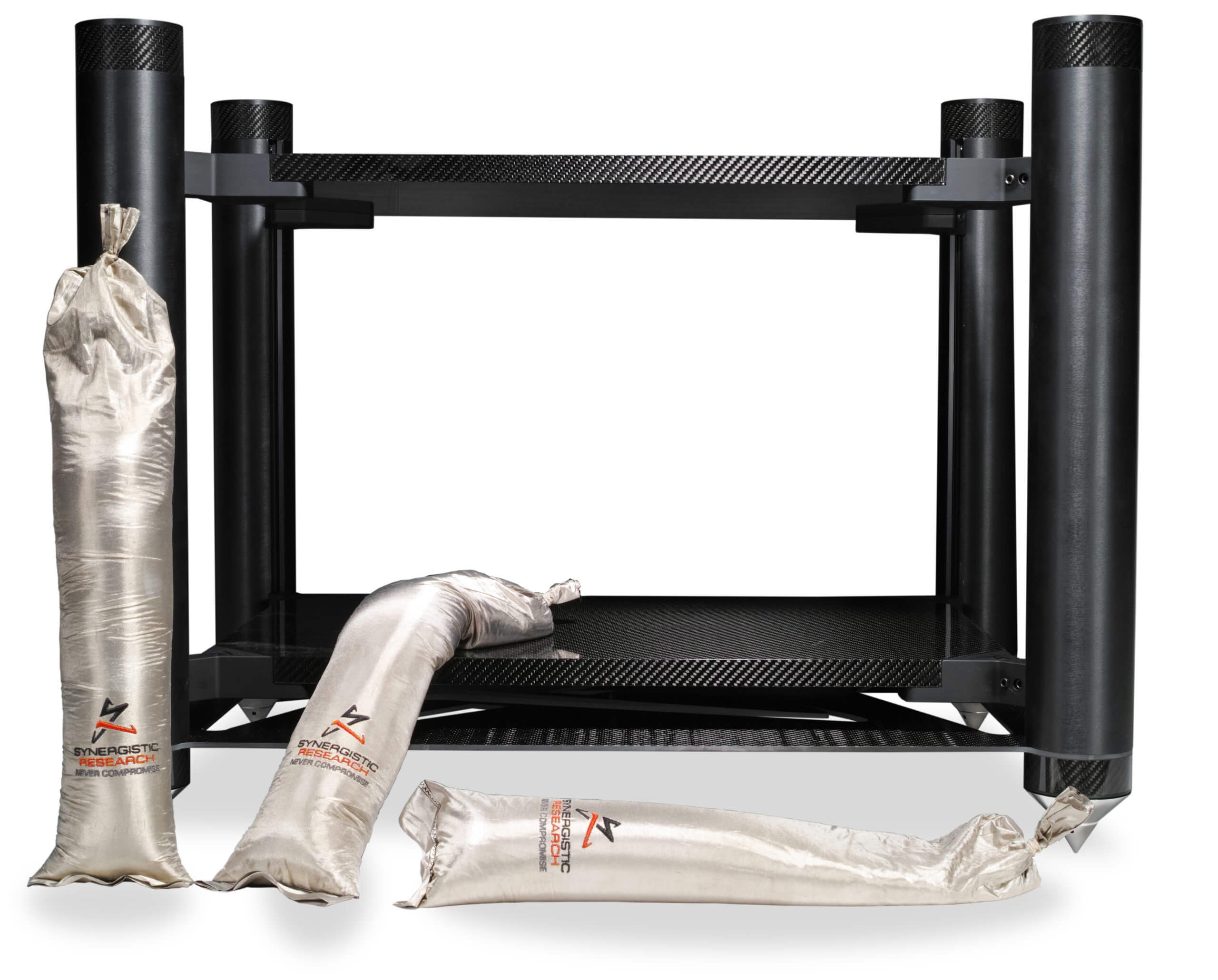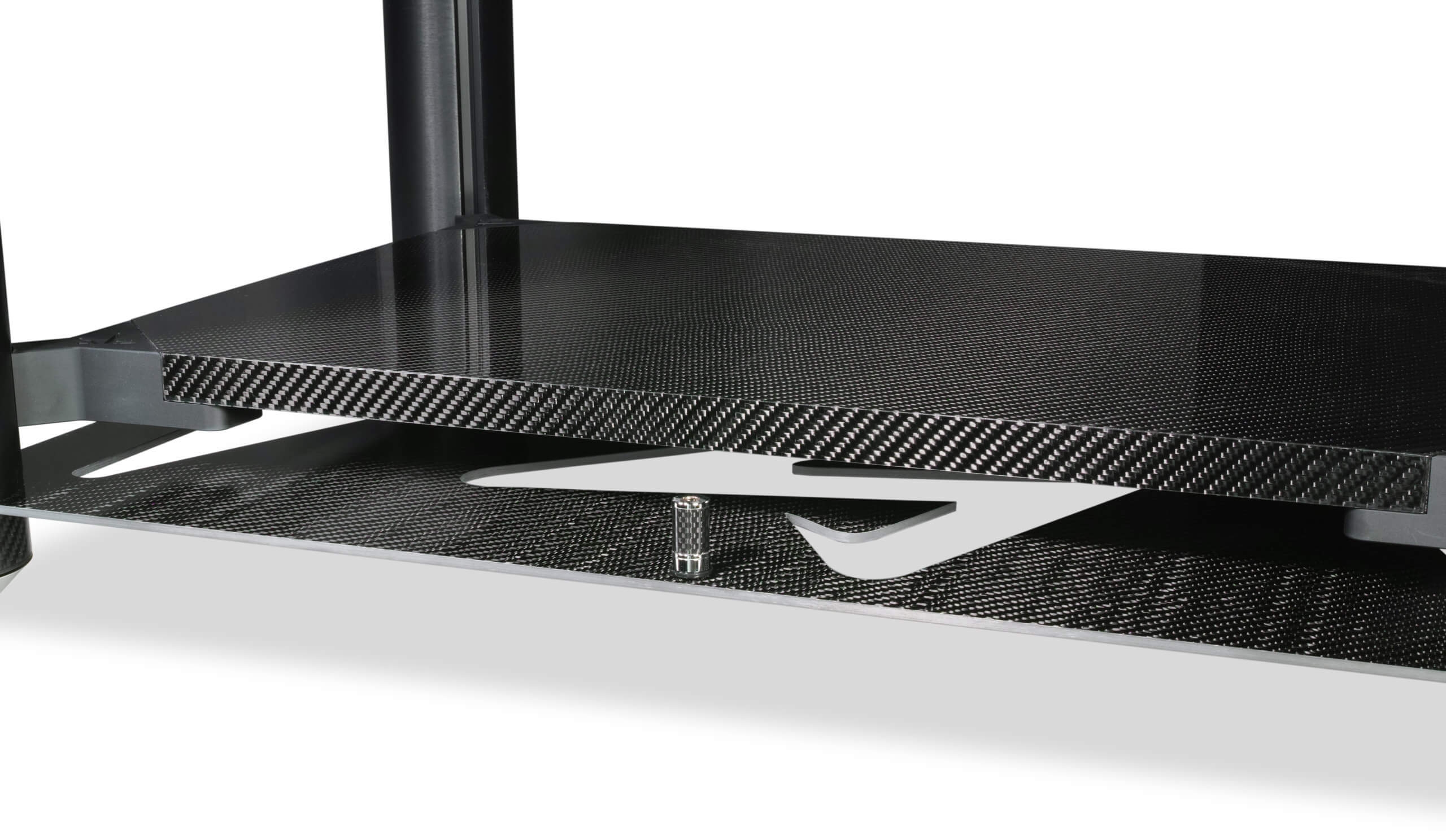 Each carbon fiber shelf was formed in an autoclave, like those used to fabricate aero kits for Formula One race cars. This gives you a transparent and harmonically uniform sound. Unlike wood, granite, plexiglass and other materials that react to vibrations in a way that amplifies specific frequencies while dampening others in a nonlinear fashion, vacuum-formed carbon fiber has a balanced response to mechanical vibration that sounds perfectly neutral and lightning fast. Next, crossbracing is handled with carbon fiber for the most balanced sound with structural stability. Finally, mass loading is executed with a proprietary matrix of dissimilar materials comprised of a conductive aggregate, including UEF Tech selected during extensive double-blind testing. It’s incredible how this final touch allowed us to voice in musicality with the unique ability to amplify the effects of our Galileo Active Ground Block, thanks to socks weaved from a conductive material for electrical continuity.