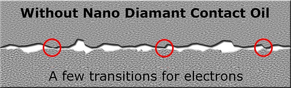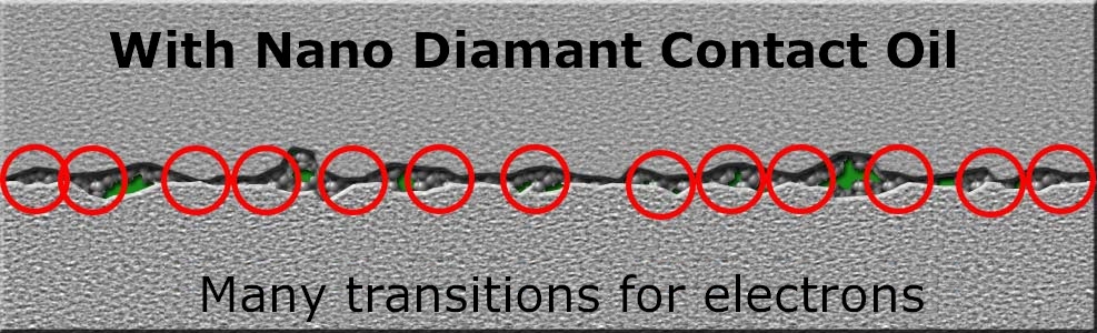 The new Nano Diamant Contact Oil tackles these problems in two different ways. The P.I. (Power Imagination) informed contact oil contains nano diamonds. These are electrically conducting structures of nanometer size, consisting of carbon, forming a diamond structure. These nano diamonds settle in the microscopic small irregularities and improve the possibility for the electrons to jump from one contact to the other. (grey in figure below). As a second effect, the Nano Diamant Contact oil in the gaps prevents pollution (green in figure below).